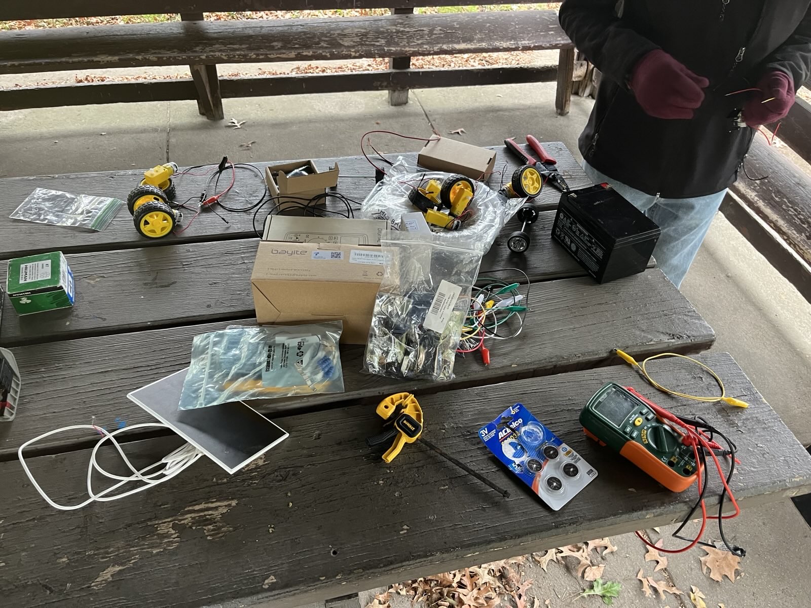Some of the assorted electronics for experimentation: toy motors, LEDs and coin cells, a multimeter, DC-DC converters, and an inexpensive current + voltage meter.