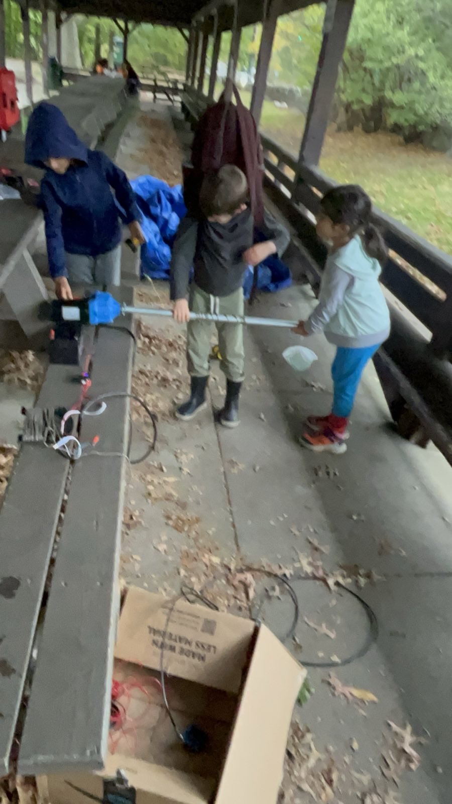 Although we weren't able to get a useful current from the panels on such a cloudy day, we were able to use batteries to drive a bunch of motors (toy wheels, drills, greenhouse side rollers), and used some low-cost voltage and current metres to learn a bit about current, voltage, and power requirements for various DC applications.